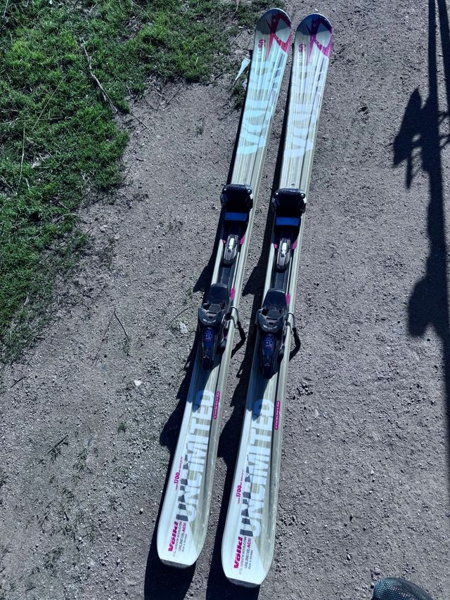 Esquís de la marca Volkl, modelo Unlimited. - Longitud de 165 cm. - Diseño con el nombre Unlimited en grande. - Fijaciones incluidas.