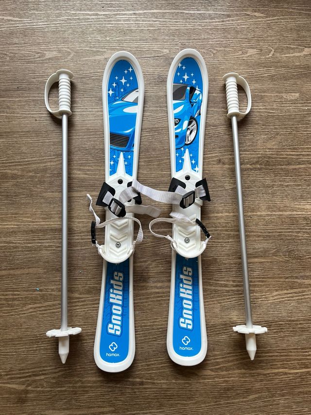 Detalles del productoSet de esquís y bastones de la marca Snowkids, diseñados para los más pequeños. Los esquís presentan un divertido diseño de coche azul sobre fondo estrellado.