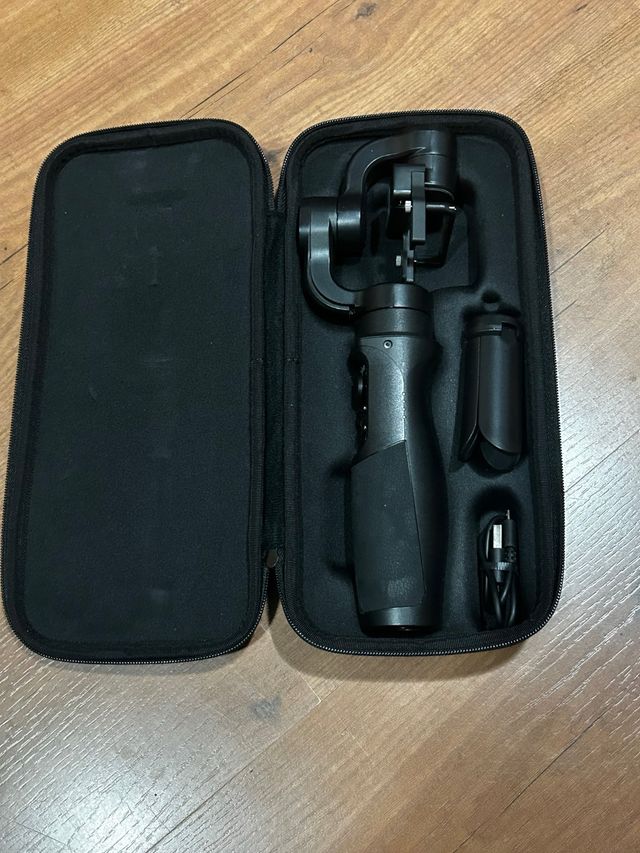 Detalles del productoEstabilizador de cámara en color negro, diseñado para cámaras GoPro y SJCam. Incluye su funda de transporte y accesorios.
