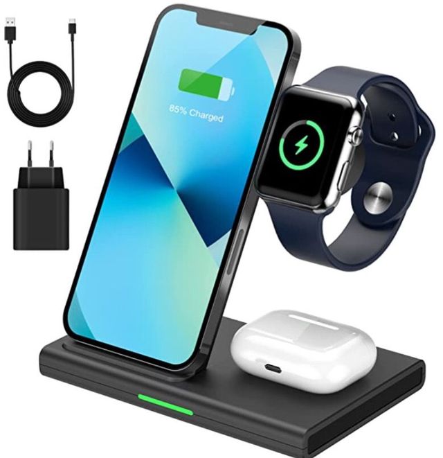 Detalles del productoCargador Inalámbrico, NEEKFOX 3 en 1 Cargador Inalámbrico Rápido, Estación de Carga Inalámbrica para Apple Watch Series SE/AirPods Pro, 15W Wireless Charger para i Phone 13/12/11/Pro MAX/XR/XS MAX.