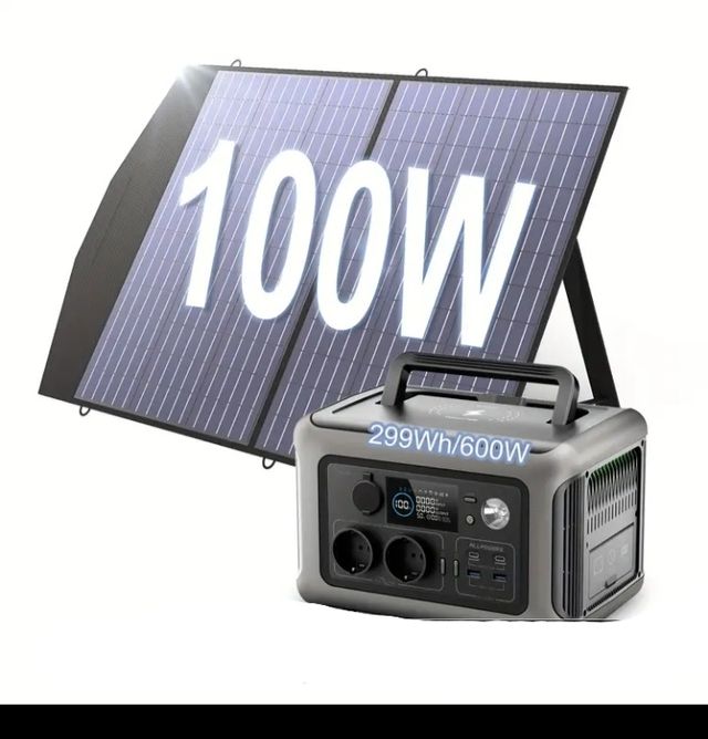 Estación de energía portátil de 600W junto con un panel solar plegable de 100W.