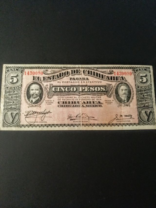 Detalles del productoBillete de 5 pesos de la época de la Revolución Mexicana encabezada por Emiliano Zapata .Es un billete antiguo y muestra señales de desgaste por el paso del tiempo.