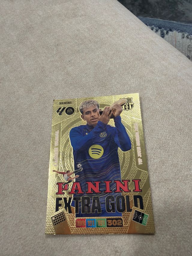 Estampita de colección de Lamine Yamal de la serie Panini Extra Gold. - Diseño especial en acabado dorado. - Ilustración del jugador en acción.