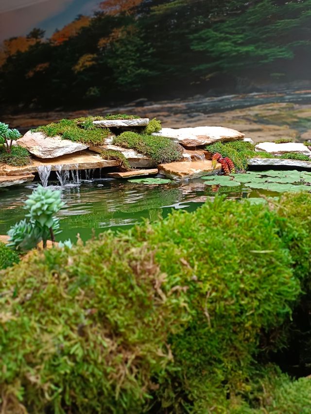Con musgo preservado, piedra de rodeno gold, con cuarcita para darle ese brillo natural de los ríos y estanques.