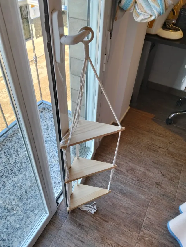 Detalles del productoEstantería de esquina de madera con tres niveles, ideal para colgar.