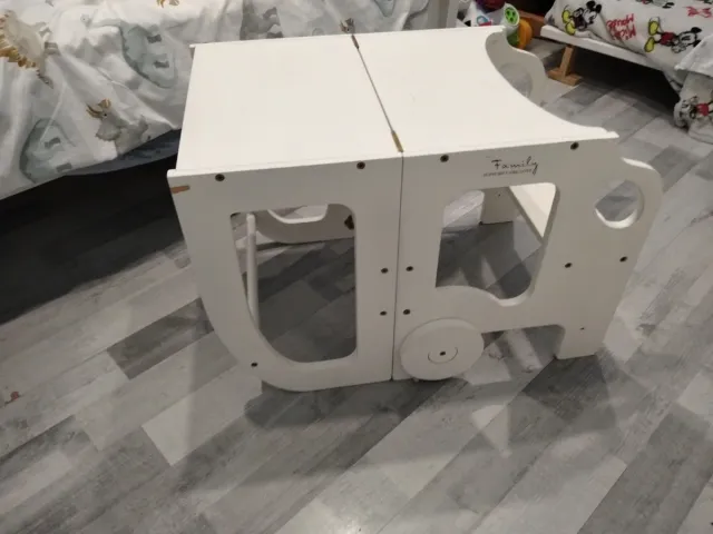Detalles del productoEstantería de madera blanca con diseño de elefante infantil.De la marca family support.care.love. .es una estantería para dormitorio de niños y se puede convertir en escritorio como mesa y asiento ,tiene varias marcas de uso de hay su precio, pero nada que le impide cumplir su función todos los tornillos y bisagras están bien ,