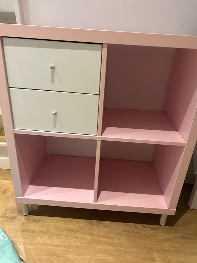 Estantería rosa. En Ikea de 76,5x 76,5 y 39 de profundidad. cuesta 34 en ikea y el modulo de cajones 20.