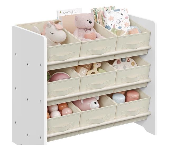 Detalles del productoPráctica estantería organizadora de juguetes con cubos de tela.