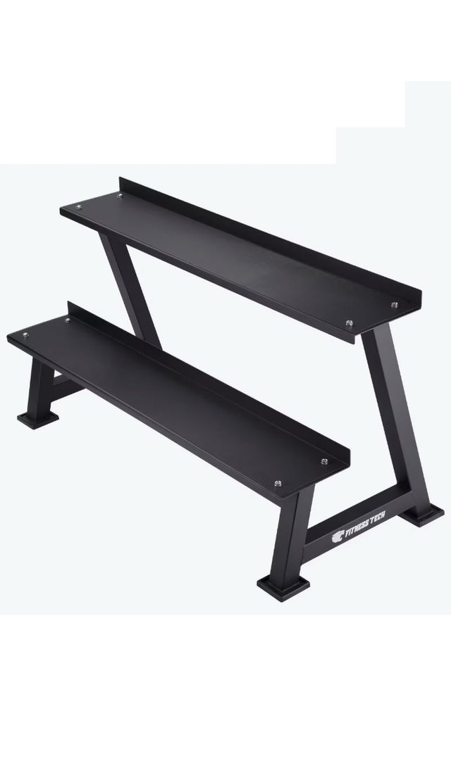 Detalles del productoEstantería de dos niveles para organizar pesas y mancuernas.
