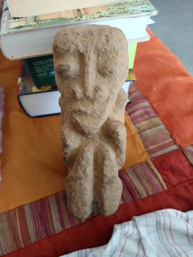 Estatua antigua con dos figuras talladas. - Diseño único y detallado. - Material de piedra o barro.