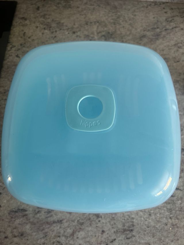 Esterilizador de plástico azul para microondas. Entran 3 biberones, tetinas, tapas y chupetes. Marca hippo's. usado tres veces, como nuevo.