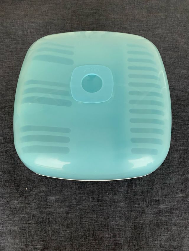 Detalles del productoEsterilizador de biberones diseñado para usar en el microondas. Su forma es cuadrada con esquinas redondeadas y tiene un color azul translúcido.