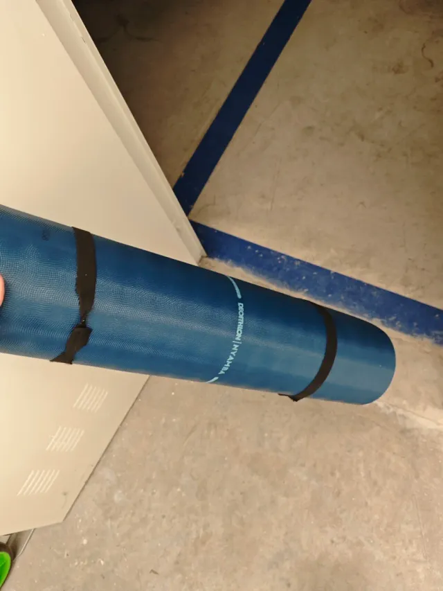 Detalles del productoEsterilla de yoga de color azul, enrollable y con cintas de sujeción.