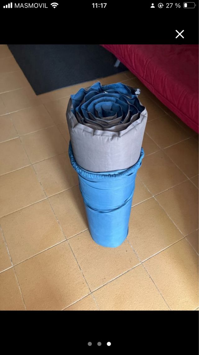 Detalles del productoEsterilla hinchable de color azul oscuro, enrollada y lista para transportar.