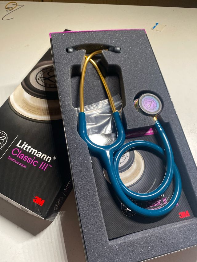 Detalles del productoEstetoscopio Littmann Classic III en color azul teal con acabados dorados. Se encuentra en perfecto estado, listo para usarse.