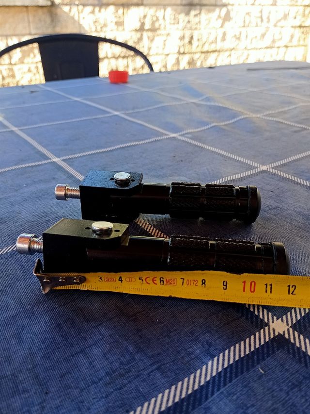 Pareja de estriberas negras para moto, ciclomotor, quads, etc, con rosca de 8 mm. - Fabricadas en metal. - Diseño con estrías para un mejor agarre.