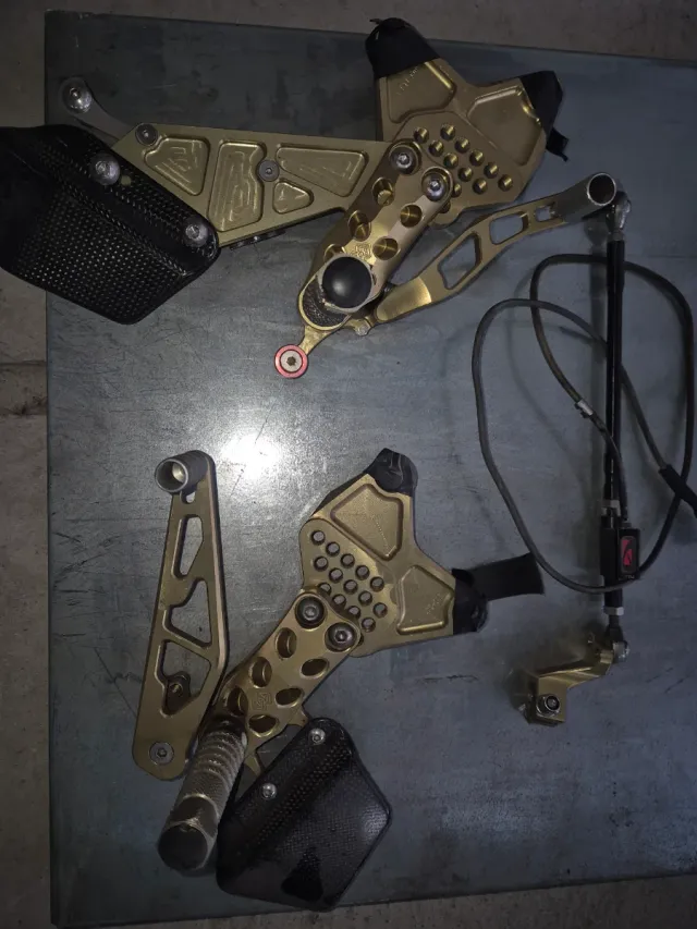 Conjunto de estriberas retrasadas para moto, con un acabado dorado. - Fabricadas en aluminio. - Incluyen palancas y soportes. - Diseño deportivo y ligero.