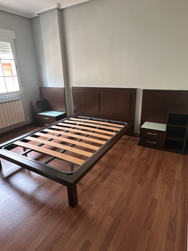Consta de un gran armario, estructura de cama de matrimonio con somier de láminas de madera, mesitas de noche, cómoda y un perchero con espejo (para trajes y chaquetas)