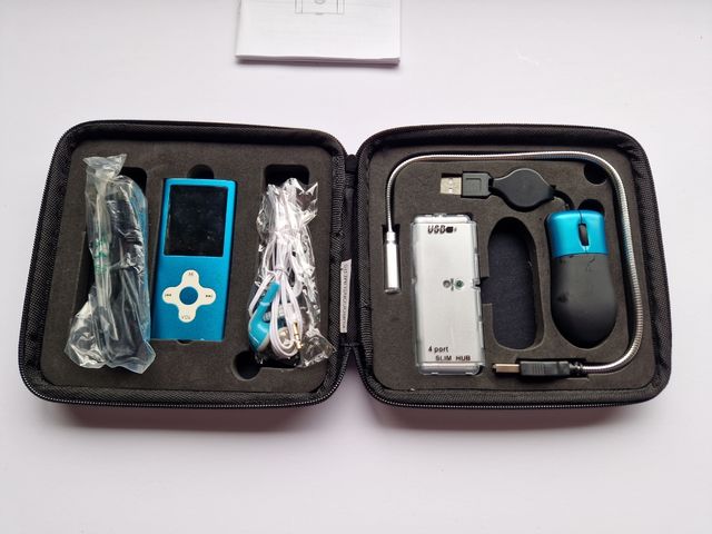 Estuche incluye: cable mini USB, reproductor MP3, auriculares, linterna USB, HUB USB, mini ratón