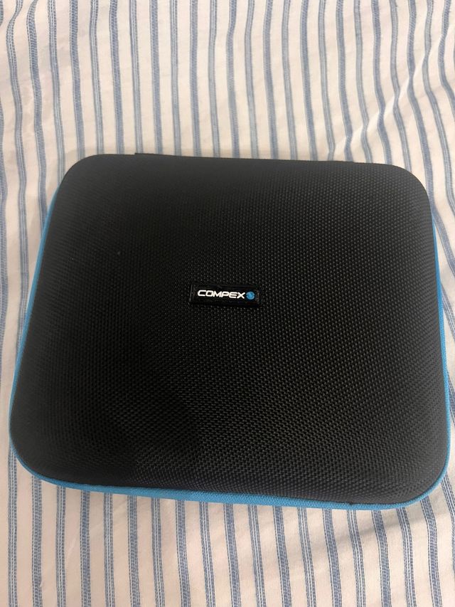 Estuche negro con ribete azul para electroestimulador Compex. - Diseño compacto y portátil. - Cierre de cremallera. - Logo de Compex en la parte frontal.