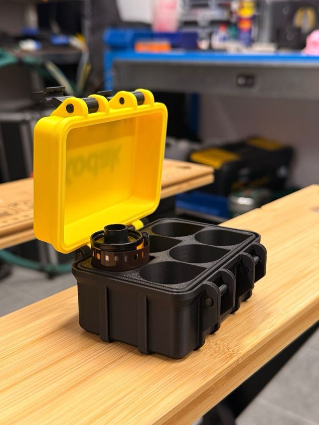 Detalles del productoEstuche amarillo y negro para carretes de película fotográfica de 35mm. Realizado con impresión 3d.