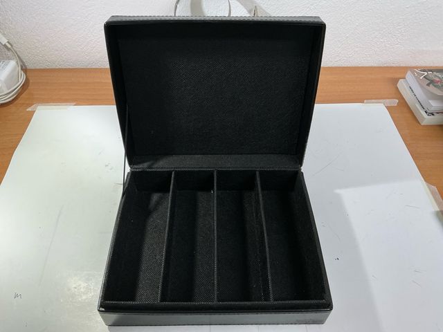 Detalles del productoEstuche negro con compartimentos para organizar cápsulas de monedas. Medidas. Ancho 22,5. Alto 7,5 fondo 17,5