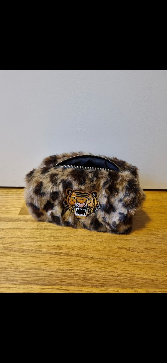 Detalles del productoEstuche de peluche con un divertido estampado de leopardo y un parche de tigre bordado.