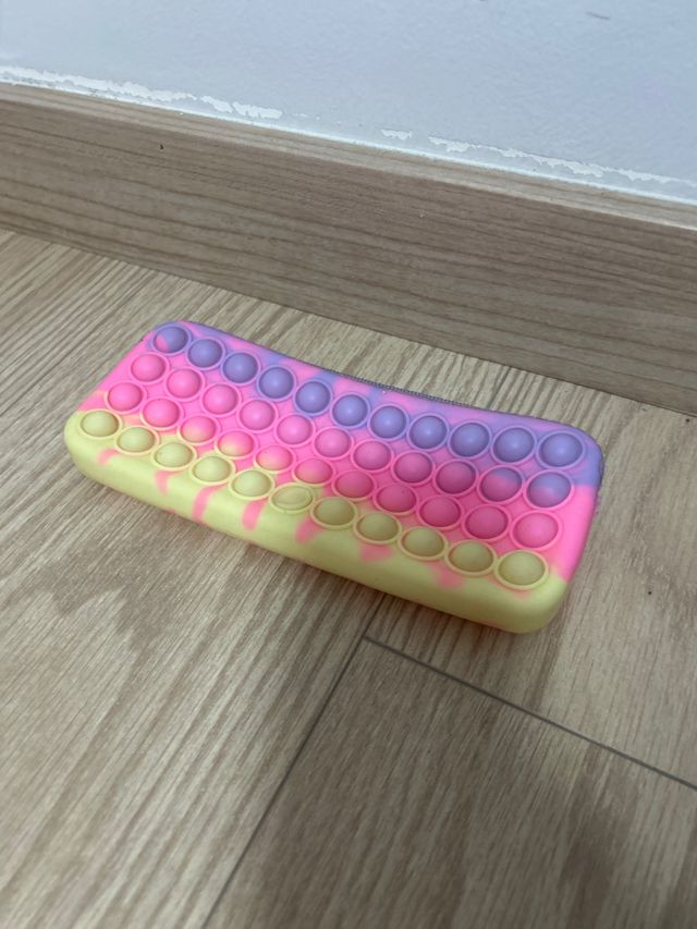 Estuche con diseño de burbujas tipo Pop It. - Colores degradados: amarillo, rosa y morado. - Superficie con burbujas para presionar.