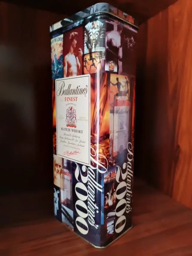 Estuche metálico rectangular conmemorativo de Ballantine's. No incluye botella. - Diseño con imágenes históricas y artísticas. - Edición especial 2000. - Material: Metal.