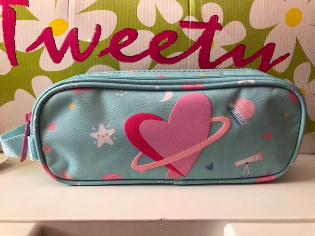 Estuche Safta con un diseño espacial y un corazón. - Color azul claro. - Estampado de estrellas, planetas y un telescopio. - Corazón rosa con un aro alrededor.