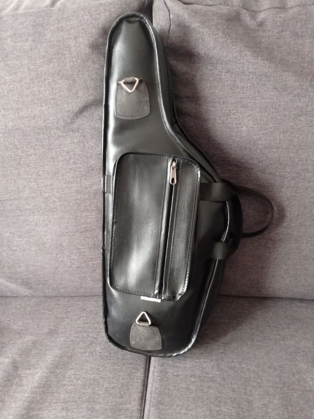 Detalles del productoEstuche de saxofón alto de piel (sintética) En muy buenas condiciones, único detalle es un paquete en uno de sus dos bolsillos y también cabe destacar la falta del tirador de la cremallera del mismo bolsillo.... Pero funciona perfectamente. Incluye correa para hombro.