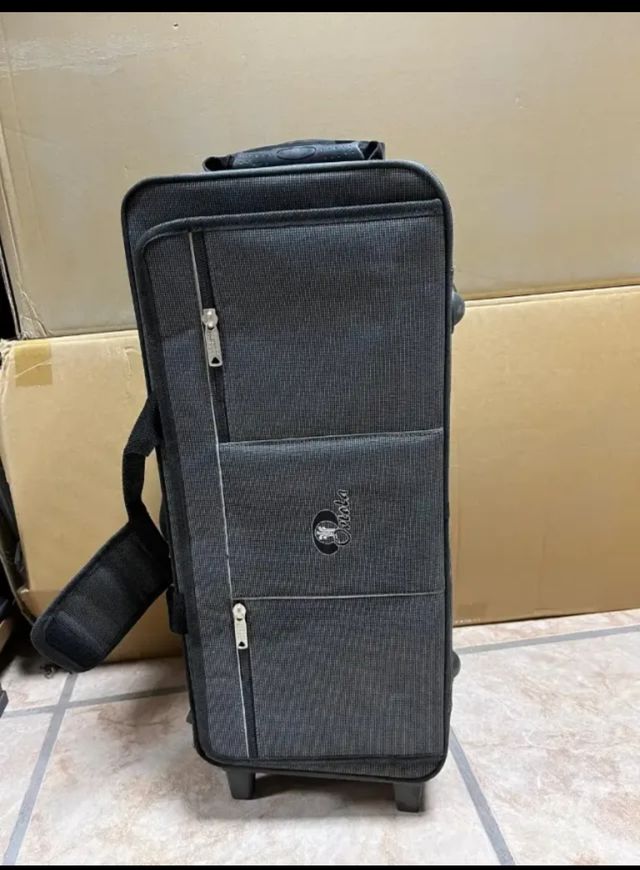 Detalles del productoTienda de música vende nuevo de outlet este estuche. LLeva algún pequeño arañazo en el plástico del carro. Estuche de poliéster, interior de velour con acolchado de poliuretano inyectado. Bolsillos, asas y ruedas. 60x25x16. Peso 3,9 kg. Bolsillo con capacidad para partituras (Folios A4) Estuche valorado en 100€.