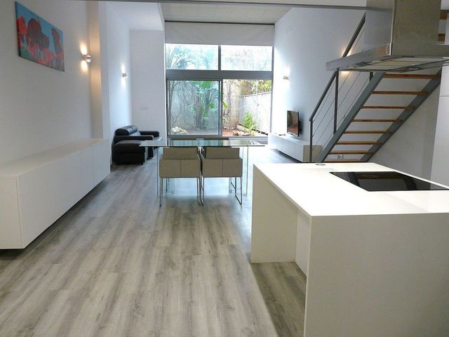 En la planta baja se encuentra amplio y luminoso salón comedor con amplio ventanal y acceso a la terraza, cocina abierta con isla y mobiliario moderno, equipada con vitrocerámica, campana extractora, horno, microondas, frigorífico y lavavajillas. Cuarto de lavandería con lavadora, cuarto de baño con plato de ducha.