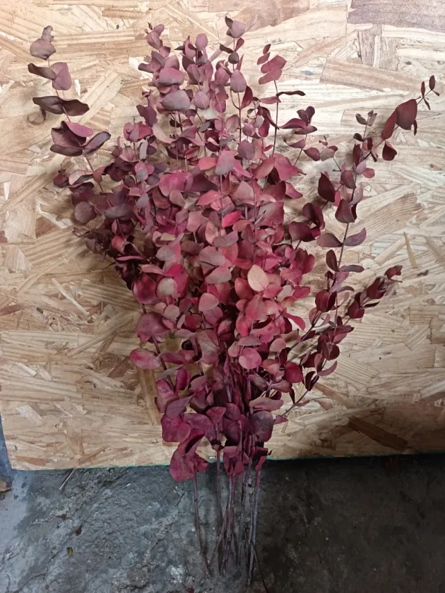 Detalles del productoRamo de eucalipto en tonos rojos, ideal para decoraciones navideñas o arreglos florales secos.