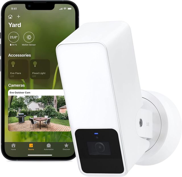 Detalles del productoEve Outdoor Cam (Edición Blanca): cámara de seguridad con foco, privacidad (HomeKit Secure Video), visión nocturna, Wi-Fi (2,4 GHz), detector de movimiento y comunicación bidireccional.