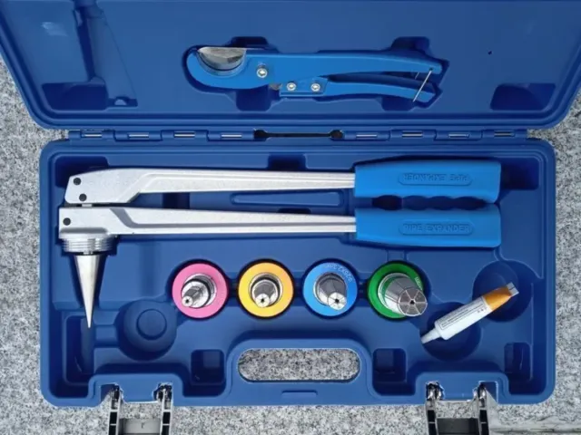 EXPANDIDOR TUBO WIRSBO UPONOR, CON CABEZALES DE 16 20 25 32, BOTE DE GRASA, TIJERAS.