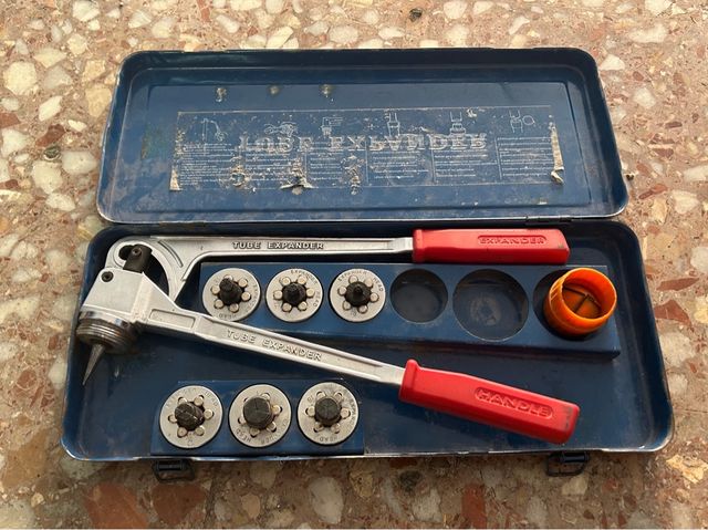 Detalles del productoHerramienta para expandir tubos de cobre, ideal para trabajos de fontanería y aire acondicionado. Incluye un juego de cabezales para diferentes diámetros.