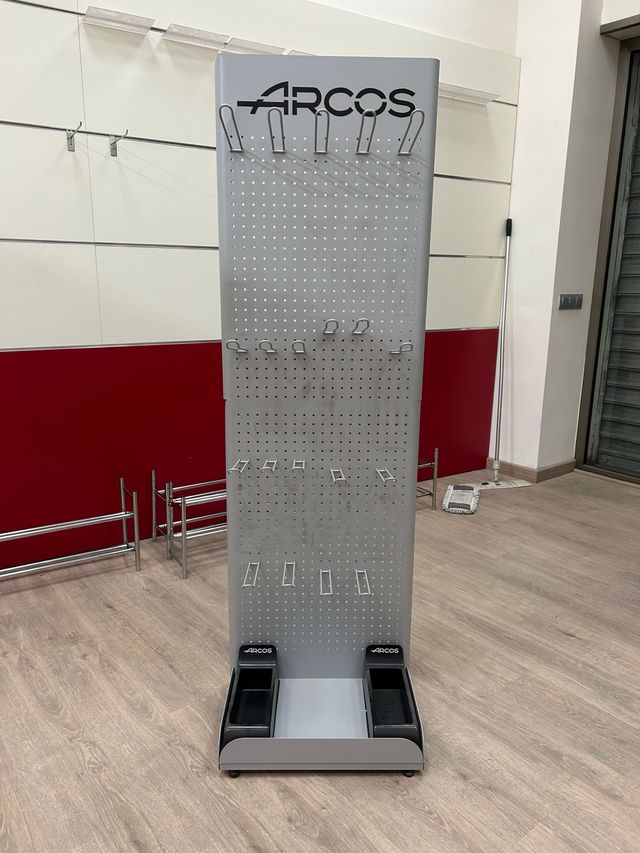 Expositor de la marca Arcos. - Diseño en color gris. - Base con dos compartimentos. - Panel perforado para colgar.