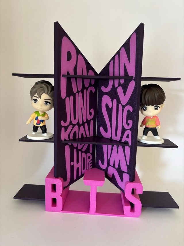 Expositor temático de BTS con los nombres de los miembros. - Diseño en forma de logo de BTS. - Colores morado y rosa. - NO Incluye dos figuras. - Base con letras BTS.
