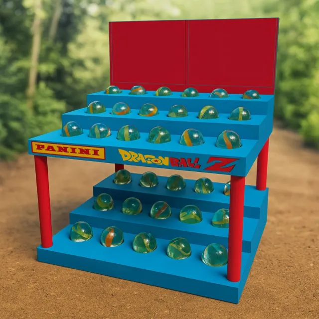 Detalles del productoExpositor para la antigua colección de 60 canicas que había de dragón ball, hecho de material duradero y resistente, con hueco también en la zona superior para exponer los sobres donde venían las canicas.