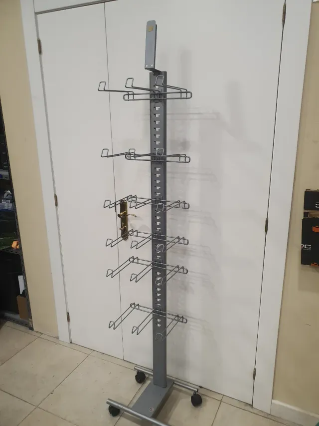 Expositor metálico de pie con ruedas para facilitar su movilidad. Ideal para tiendas o eventos.