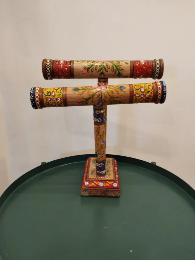 Detalles del productoElegante expositor para collares y pulseras, con un diseño artesanal y colorido.
