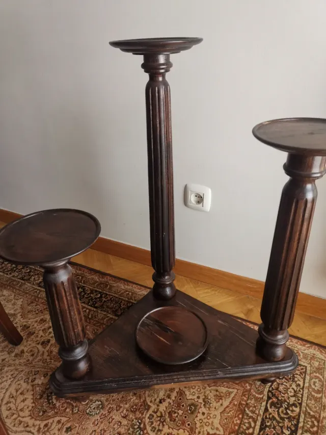 Detalles del productoElegante expositor de madera oscura con tres niveles para colocar plantas u objetos decorativos. Su diseño triangular lo hace ideal para esquinas.