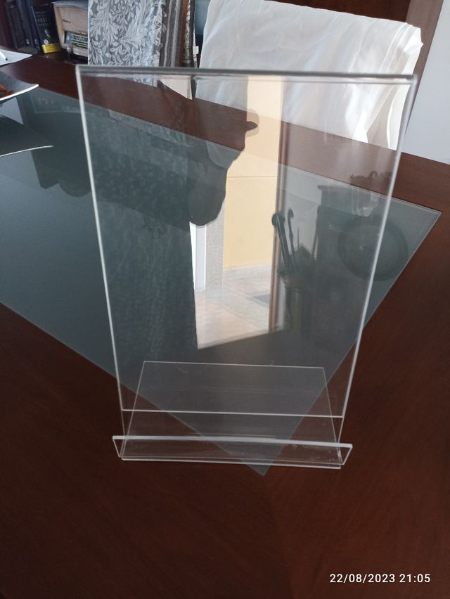 Detalles del productoExpositor en metacrilato. En buen estado. Medidas: 21,4cm (ancho) x 13cm (base) x 33cm (alto) aprox Medidas del producto