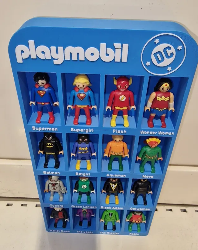 Cada huequito con su nombre, con el logo de DC y el de Playmobil!