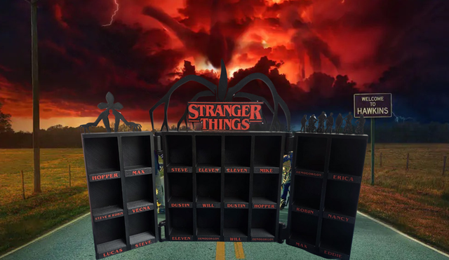 Detalles del productoExpositor plegable de funkos temático de Stranger Things, ideal para coleccionistas. Fabricado con impresora 3D, se fabrican bajo pedido