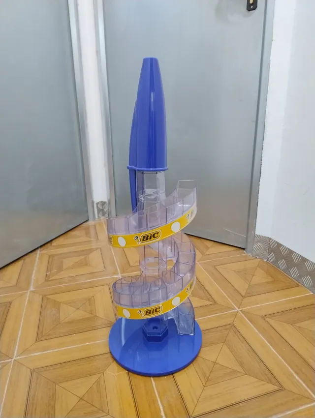 Detalles del productoExpositor de plástico transparente con forma de espiral y base azul. No incluye los bolígrafos!.