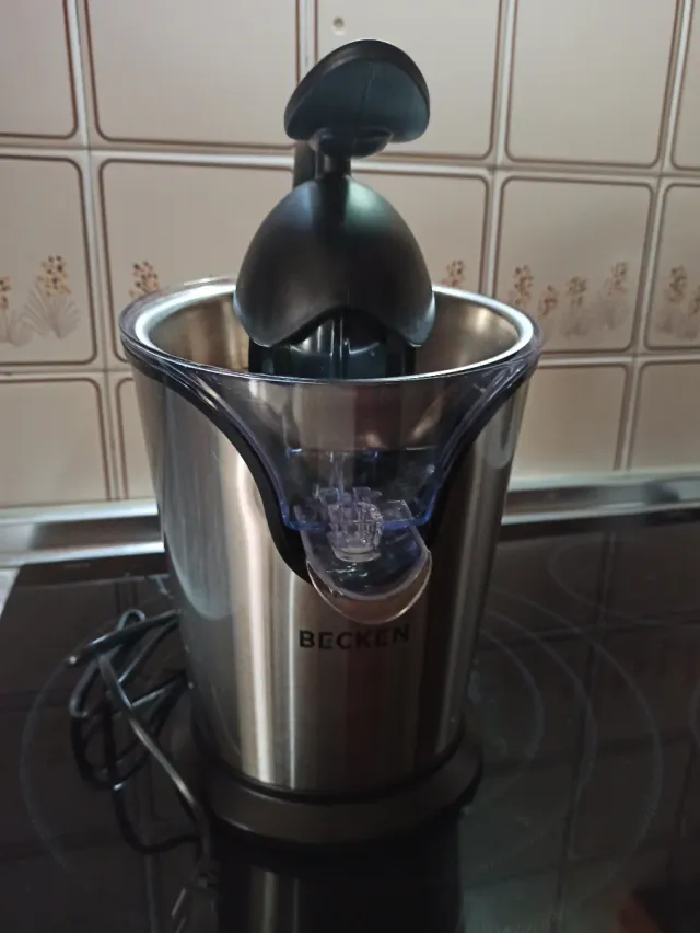 Detalles del productoExprimidor de la marca Becken con acabado en acero inoxidable.