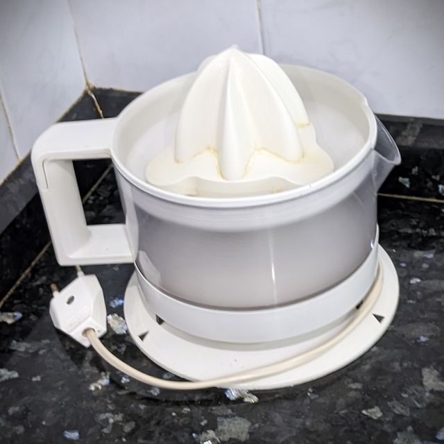 Ideal para preparar zumos rápidos. Dispone de giro automático al presionar, recogida de cable y todas sus piezas están completas y operativas.