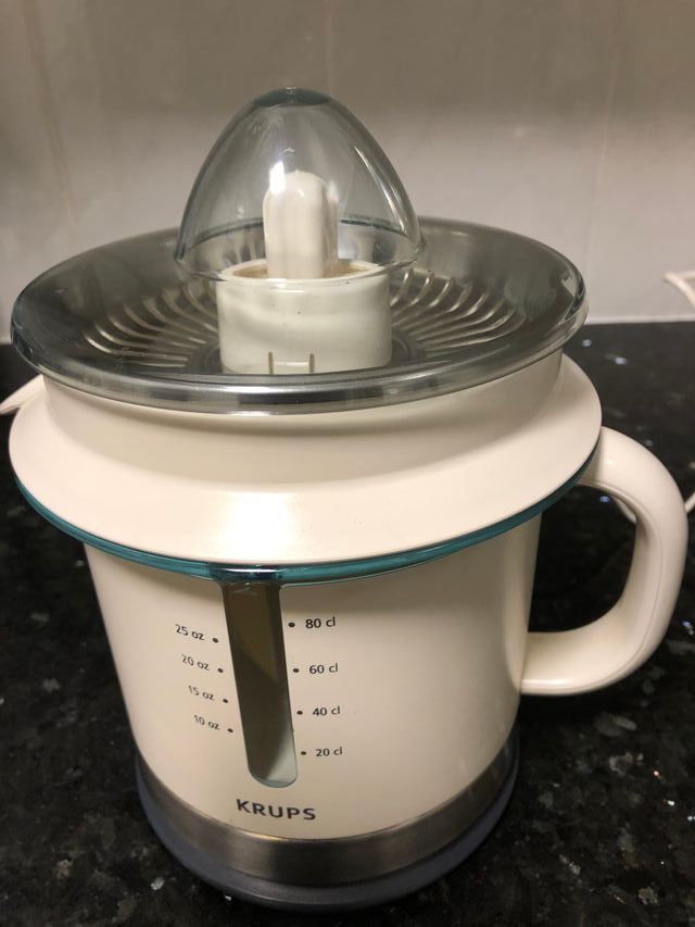 Detalles del productoExprimidor de zumo KRUPS, casi nuevo, funciona perfectamente, se nos perdió el cono para exprimir y quedó olvidado. Pueden utilizarse otros conos seguramente de distintas marcas, con seguridad los de Moulinex Ultracompact (los recambios son más baratos). En la segunda foto se utiliza el Moulinex citado sin ningún problema tal como se puede apreciar. En la tercera foto se ve el cono (con rejilla incorporada) utilizado y en la cuarta el modelo concreto de cono Krups (figura B) según libro de instrucciones. Se limpia muy fácilmente. Pesa 950 gr. y las dimensiones son de unos 25 cm aproximadamente de alto y profundidad. ÚLTIMO PRECIO